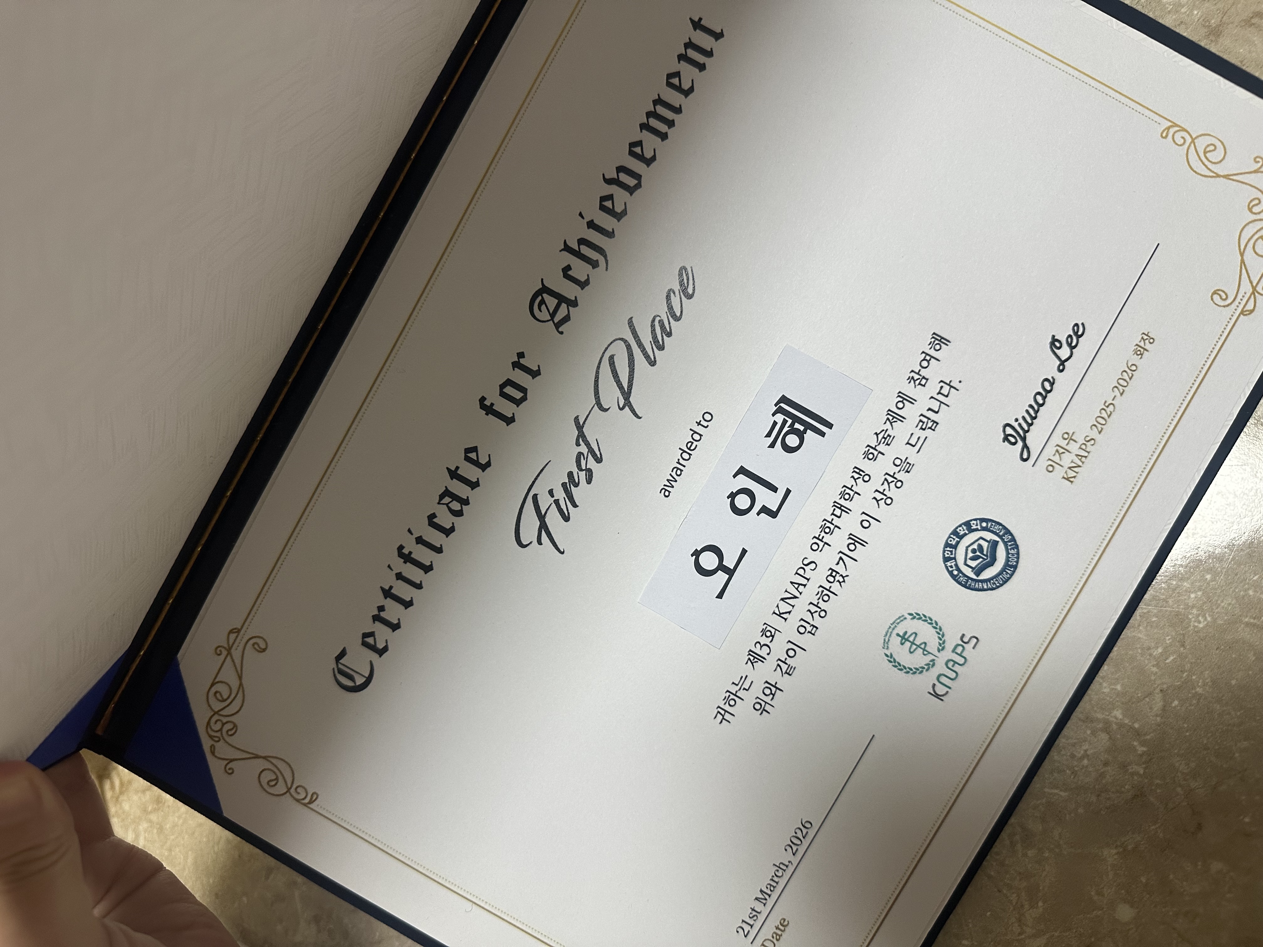 제3회 한국약학대학생연합회(KNAPS) 학술제 1등상 수상